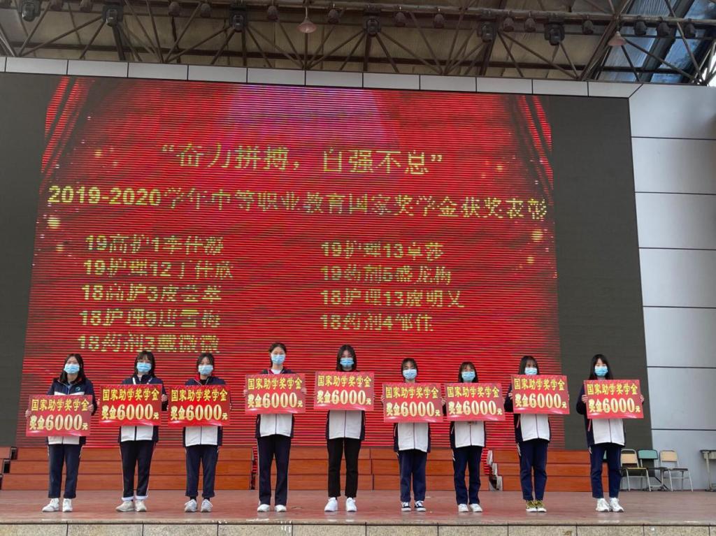 共评选出2019-2020学年中等职业教育国家奖学金获得者19高护1班李佳凝、19护理13班卓莎莎、19护理12班丁佳欣、19药剂5班盛龙梅、18高护3班皮芸萃、18护理13班廖明乂、18护理9班唐雪梅、18药剂4班邹佳、18药剂3班戴微微等9名同学。