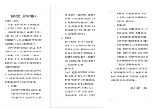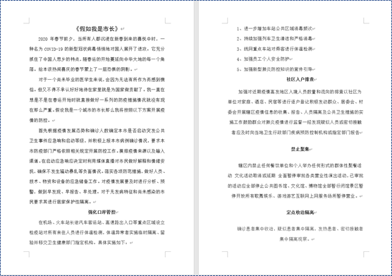 同学们围绕“假如我是某个市的市长­——要落实好‘封城’这个非常重大而又敏感的防疫举措,应该如何布置工作,才能实现既防控又安民?”、“假如我是雷神山医院建设的总指挥——需要在10天之内建设出一所医院,该如何进行时间规划、任务分工与资源调配?”等假设性的话题,尝试进行换位思考,设计成自己探究与探索的课题,写出自己的解决方案;利用假期时间,运用身边可利用的资源,通过组合、描绘、剪裁、组拼等手法制成创意防护服、口罩,充分展示了同学们的爱国情怀和创新,在此次疫情防控狙击战中贡献自己的一份力量,也让这个延长版的假期变得难忘而有意义。