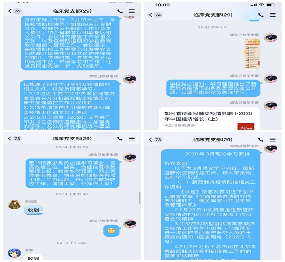 疫情期间,临床党支部坚决做到防控教学两不误。支部全体教师积极响应“停课不停教、停课不停学”,按照学校安排,认真开展线上教育教学。
