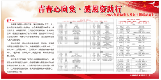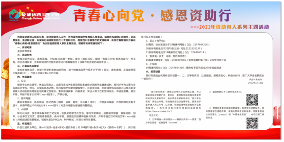 为落实立德树人根本任务,深化资助育人工作,结合庆祝建团100周年,根据上级文件精神,我校于2022年3月在全校开展以“青春心向党·感恩资助行”为主题的资助育人系列主题活动。