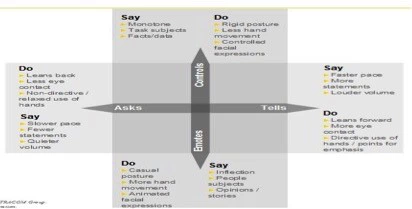 Asks&Controls(Analytical style):讲话平四平八稳,关注的更多的是事实和数据,肢体语言相对比较少,面部表情也比较少而且很少直接的用很夸张的手势。