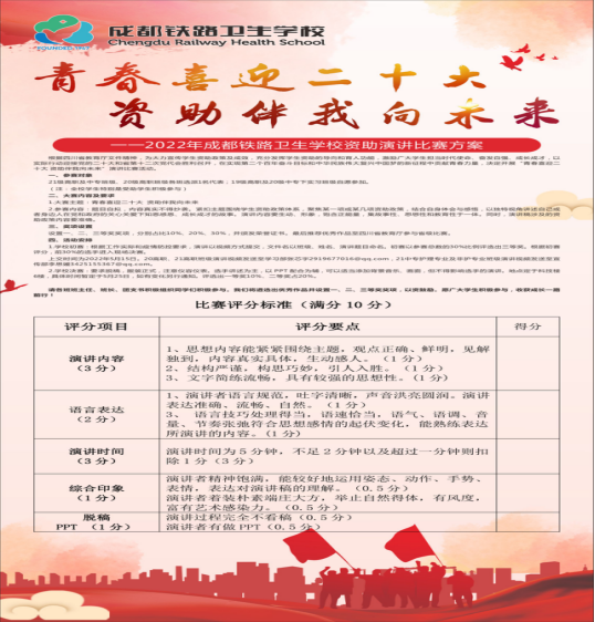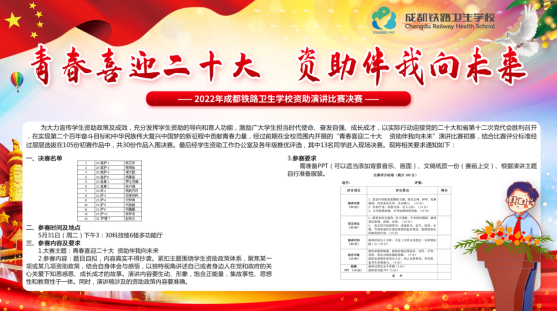 为大力宣传学生资助政策及成效,充分发挥学生资助工作的导向和育人功能,激励广大学生担当时代使命、奋发自强、成长成才,学校开展了以“青春喜迎二十大,资助伴我向未来”为主题的演讲比赛。2022年5月31日下午,在学校科技楼6楼多功能厅举行演讲决赛,全校各班学生代表到场聆听。