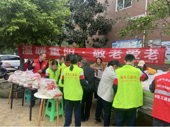在重阳节来临之际,我校公益社的志愿者们与马街社区党组织给社区老人送温暖。志愿者们用最诚挚的笑容,带着最亲切的问候,将准备的米面粮食分发到每一位老人手中,志愿者们还为部分行动不便的老人送慰问品到家里。