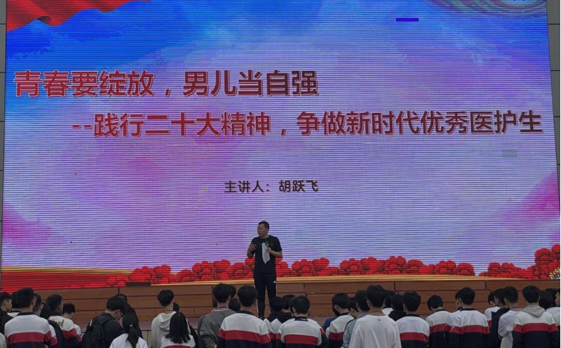 学生科科长胡跃飞以学习贯彻党的二十大精神为切入点,从祖国未来的前景与发展落地于职校学生的个人使命担当,引出“男儿当自强”寄语,结合青春期男生的阶段性特点,从学生综合素养发展方面出发,在身心健康、个人修养、学业和专业、发展规划四个方面,对全体男生提出“四有”要求——有主见、有态度、有正能量、有责任担当。