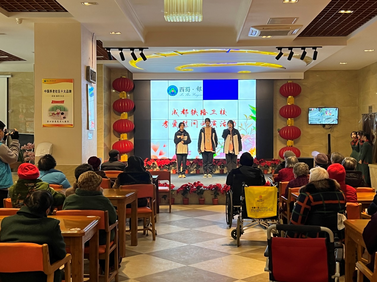 为进一步弘扬中华民族“尊老、孝老、爱老、助老”的传统美德,践行社会主义核心价值观。12月5日上午,成都铁路卫生学校学生社团爱心社联合绿色公益社、康复技能社、乐舞社、爱乐社走进西蜀·银杏康乐园,开展“红心向党·志愿同行”主题教育慰问义演实践活动。